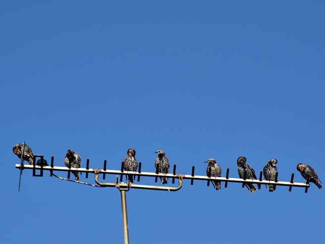 Starlings all lined up on the roof enjoying the sun.