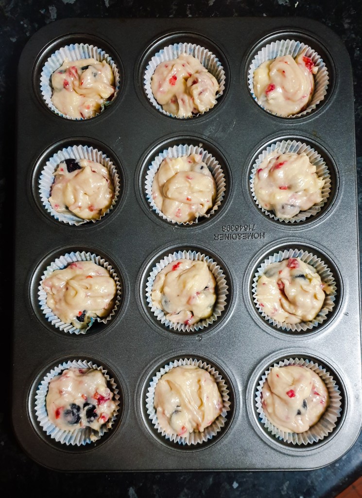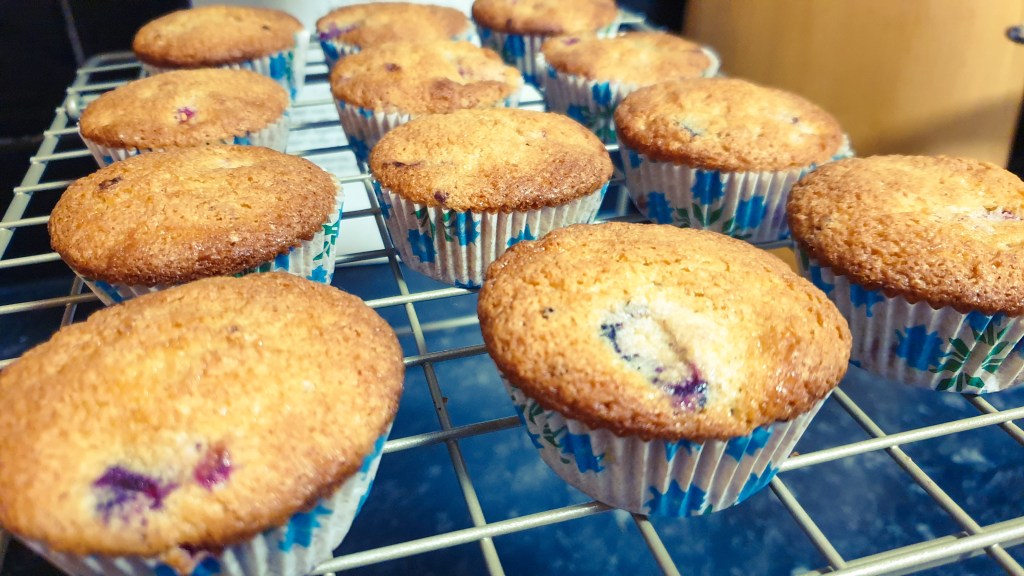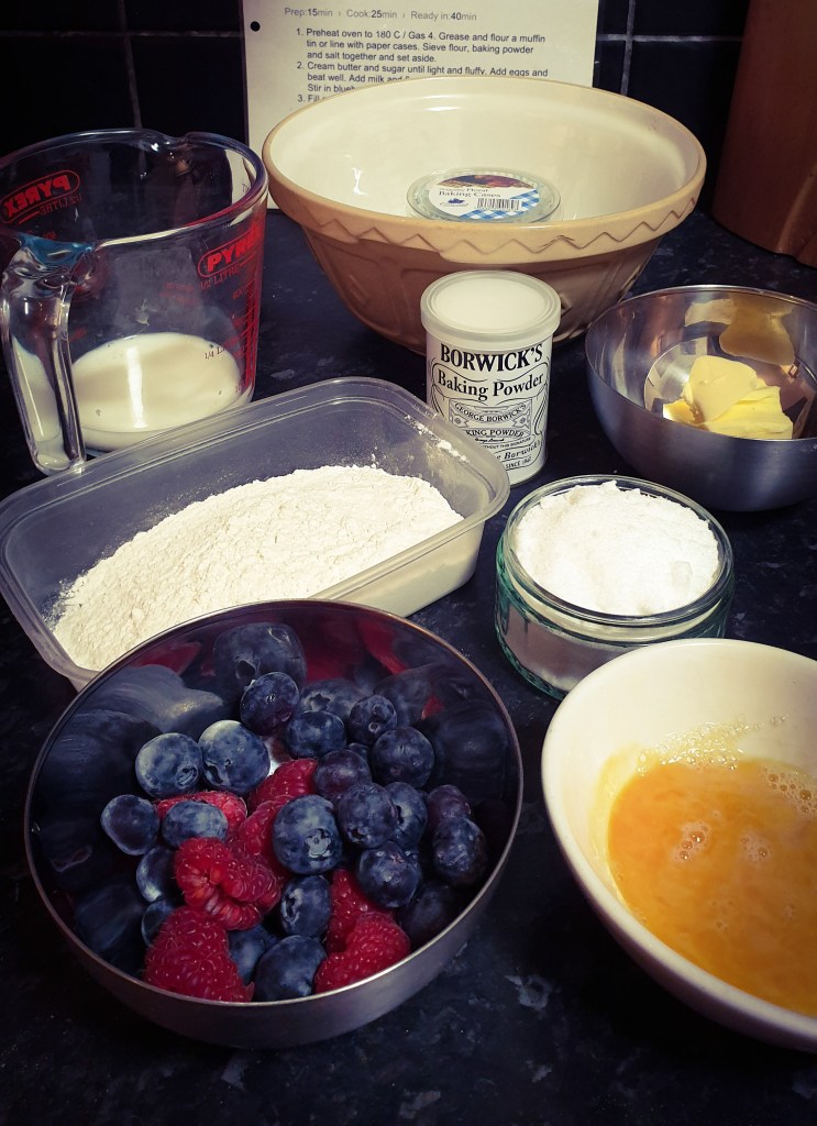 I like baking, sweets more than savoury so far and this recipe is a favourite of mine for some tasty cakey fruity treats. I have amended the recipe to scale down the ingredients. I’m not a big eater and my husband does not eat hardly anything I bake, so smaller the recipes get. But this still makes 12 little cakes. The original receipt is just for blueberry muffins, but they seem more like fairy cakes than muffins, and I decided to add raspberries to give it an extra zing and gooeyness. Full recipe at bottom of post.