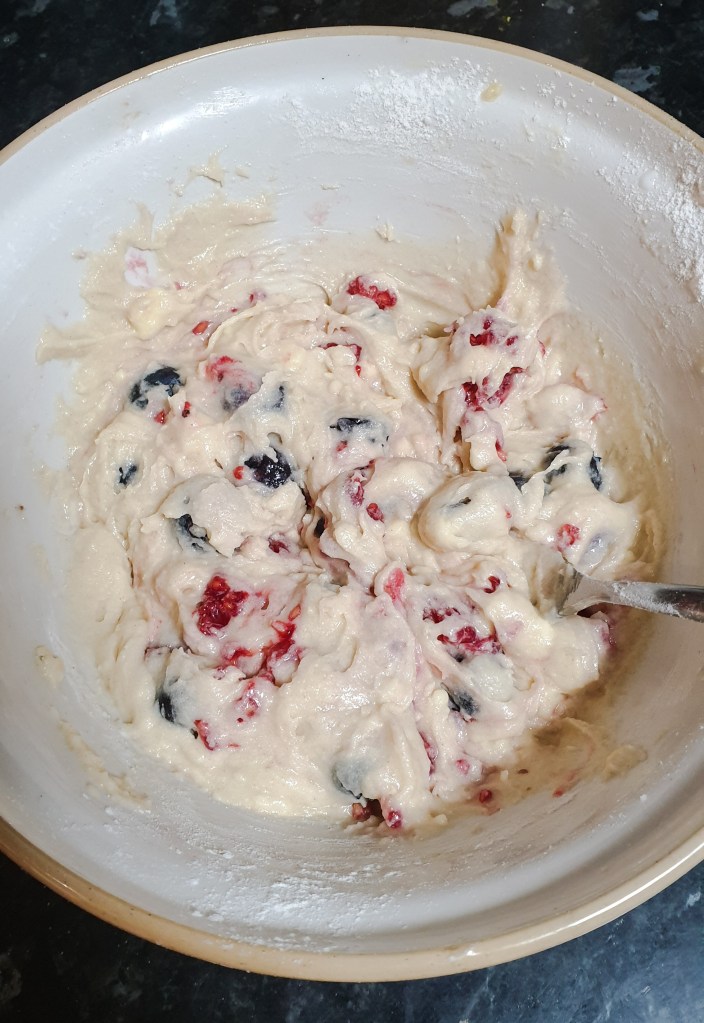 I don’t tend to stir in the fruit too much otherwise you lose the raspberry a bit and from experience cut a few of the blueberries in half. Otherwise they all have a tendency to sink to the bottom of the cake, which is nice, but better to have them do that and still be throughout as well.