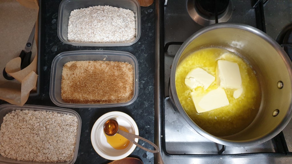 For some unknown reason over the years I completely forgot I liked flapjacks and had two jobs in bakeries, one of them being a trainee confectionist. The next batch I make might just have to half dipped in chocolate, so watch this space. From nowhere though recently, I decided to make them. I like to be organised when baking sweets things and always weigh everything out out first, I didn’t have a recipe for this so looked through the internet until I found one and scaled down the measurements for a small batch.