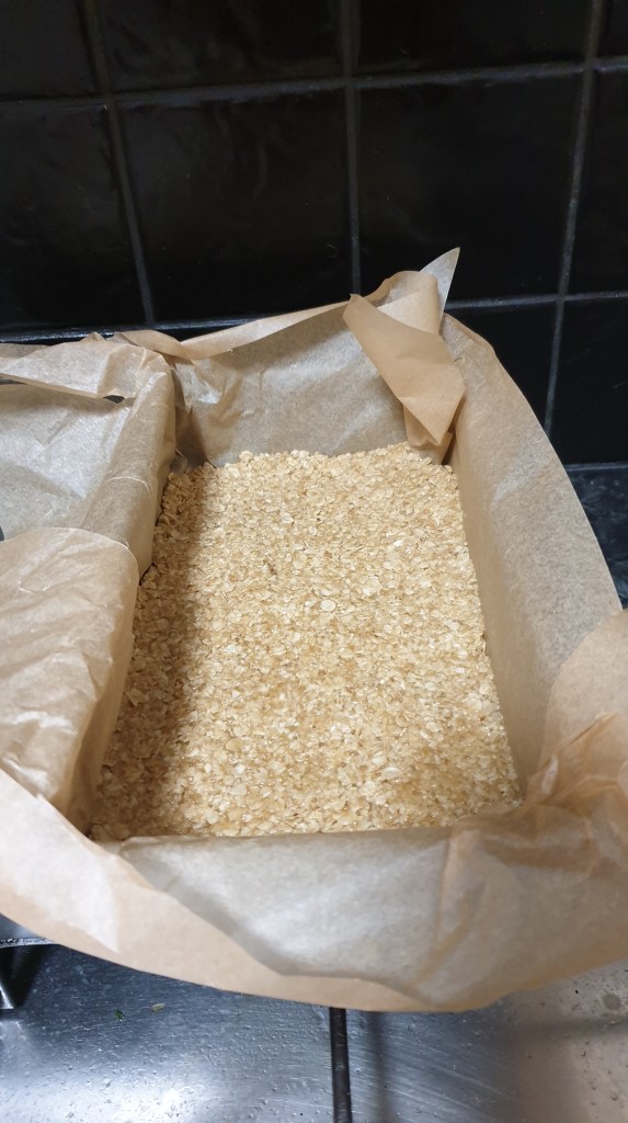 Melt the butter and add the sugar and golden syrup. When the sugar has melted stir through the oats. Then press into your prepared tin and smooth out (you can use the back of a spoon to press it flat).
