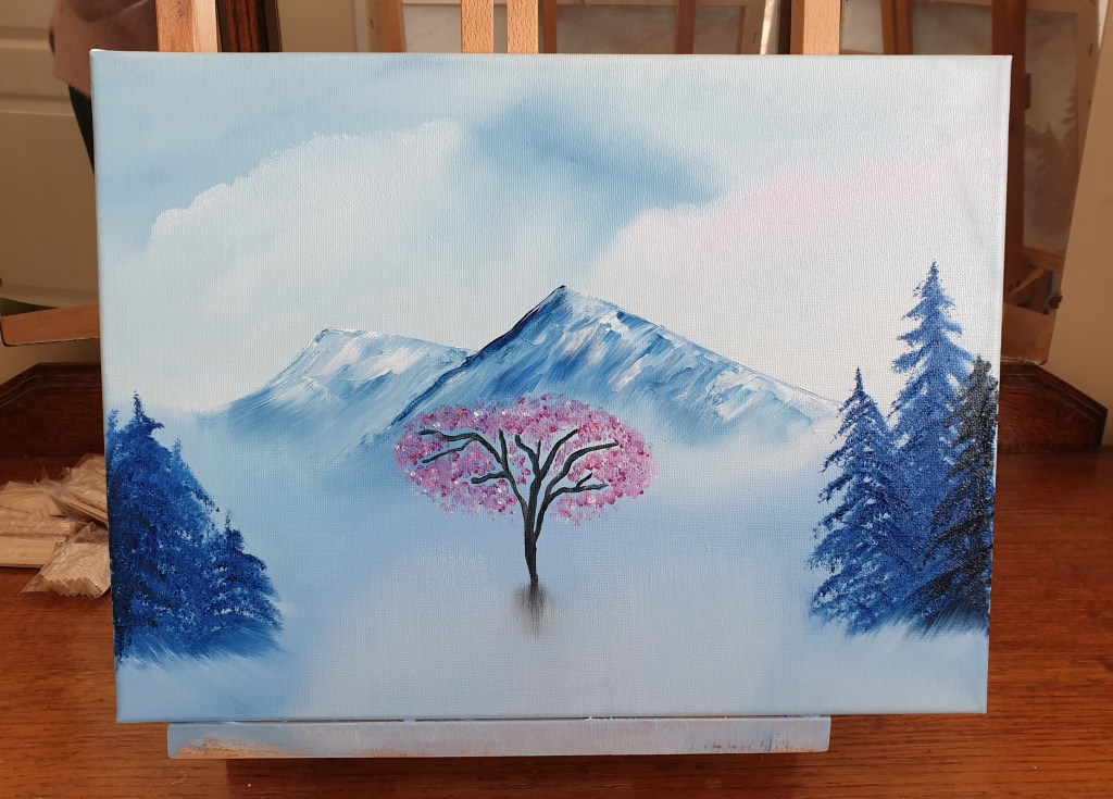 My painting isn’t coming along as quickly as I would like. Finding the time and the inclination together at the moment is fleeting. Life can be distracting at the best of times, but currently – and rightly so, my brain is occupied by more pressing matters. However, in an attempt to try something from Bob Ross’s series, thought I would try clouds, mountains and trees.