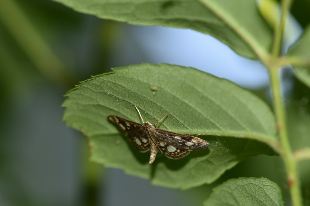This is a first for me seeing an elderberry Pearl moth. It was hiding amongst the rose leaves and luckily settled again for a few moments while I got a few shots.