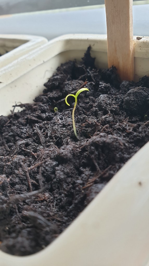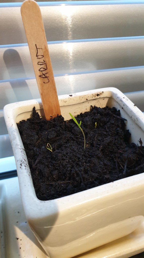 My kitchen window sill has now become the seed growing spot. I see them every morning and throughout the day, so realised that is their best chance of light every day, and general survival. After planting out the peppers, I started carrots at the at the same time as the broccoli and they finally started, its taken a week for these seeds to get going at all, but within a day of them showing signs of pushing through, we have more. It is on! 🥕