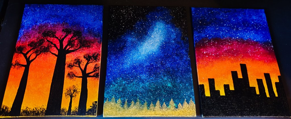 I really liked the sunset baobab trees painting so did another sunset one. And an extra one to create more stars, thought they looked quite nice together.