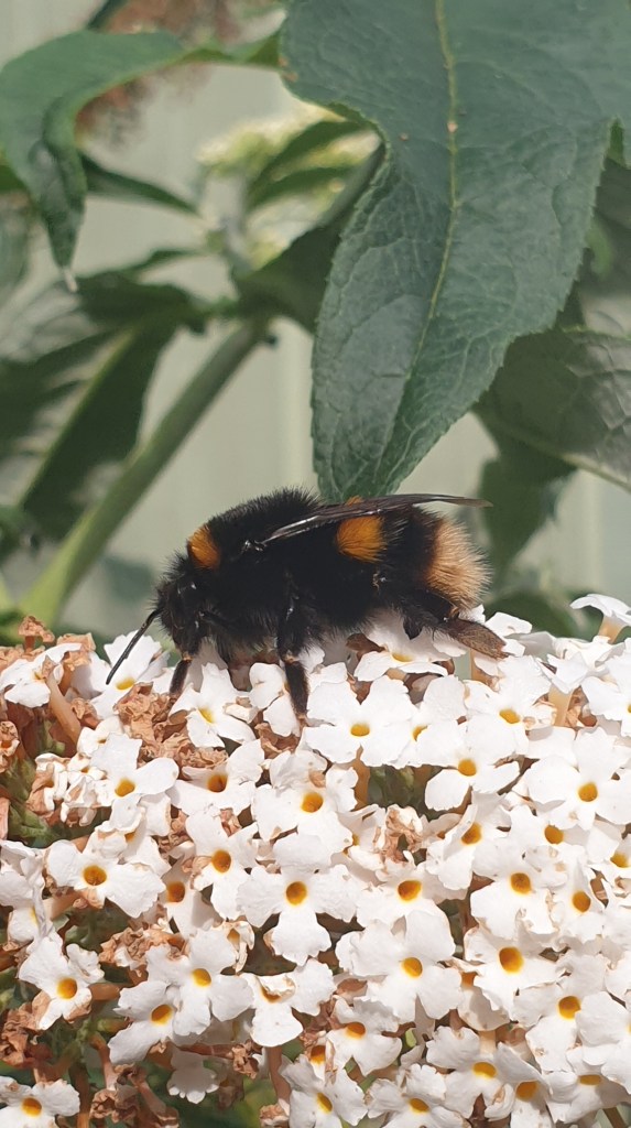 Yesterday saw the arrival of the very large bumble bees, I don’t think I have seen ones that big since being in Spain. But they also love the buddleia, even disappearing into it on their forage. But this one was a timely hit of the record button in slow motion as it took off. It was only after playing it back did I realise that the sound had picked up the wings sounding like a chopper 🙂 – sound on for full effect.