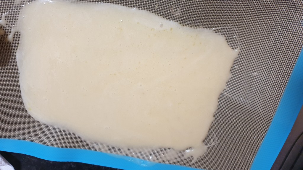 Once you are happy with the texture, pour onto a highsided tray (avoid scraping the sides or the gritty sugar will come with it) – try not to use glass as this mixture will be very hot and may break it. Now, I don’t have large marble slab to hand like the person who’s recipe I checked out, so I used a baking tray with sides, and laid one of my new heat proof baking sheets clumsily in it.