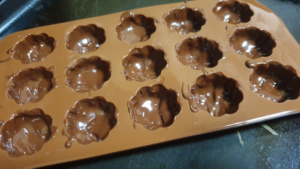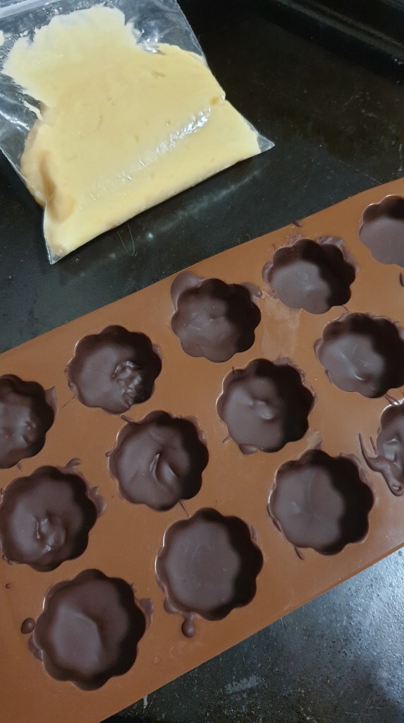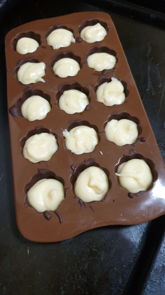 Fill each mould space with filling, but not quite to the top. Then melt up the second round of chocolate and place over the top.