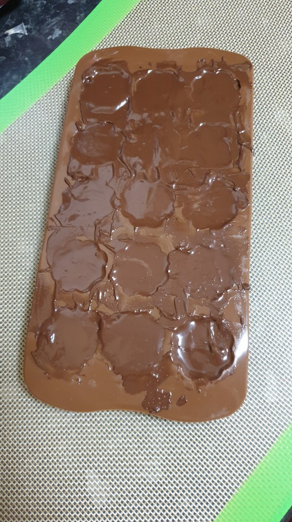 I used a small spoon to put some in each space, then used a paintbrush 🖌 to get the chocolate up the sides. Then put in the freezer for about 15 minutes.
