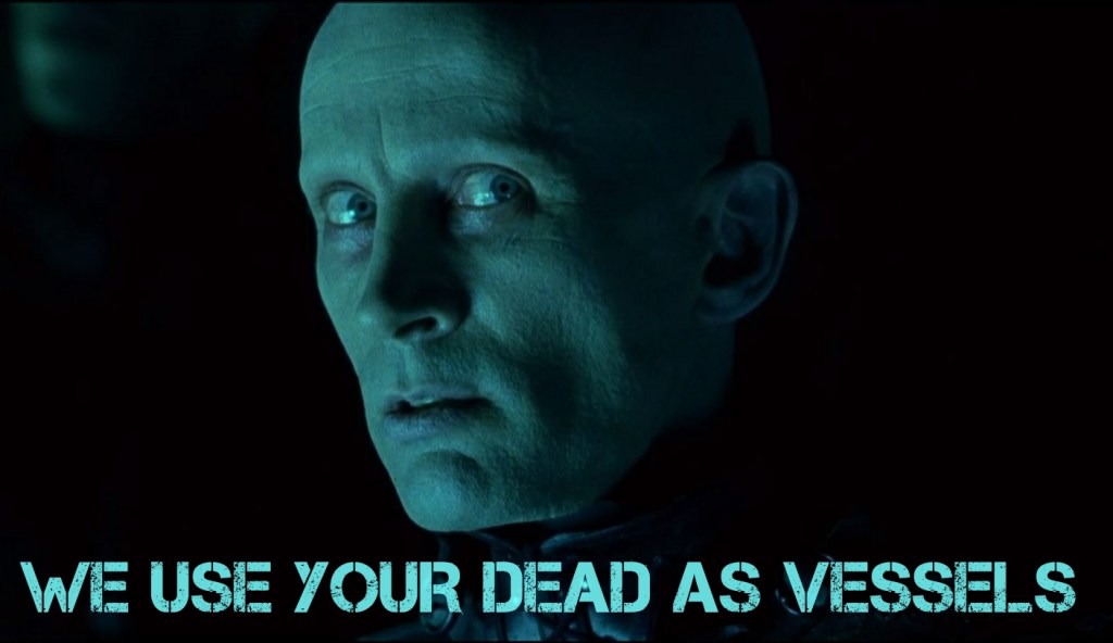 Dark City (1998) – this one pops up a lot because it’s got it all. But for this theme it’s the reveal to the confused main character about what they are. The picture and quote are from this film. “We use your dead as vessels”.