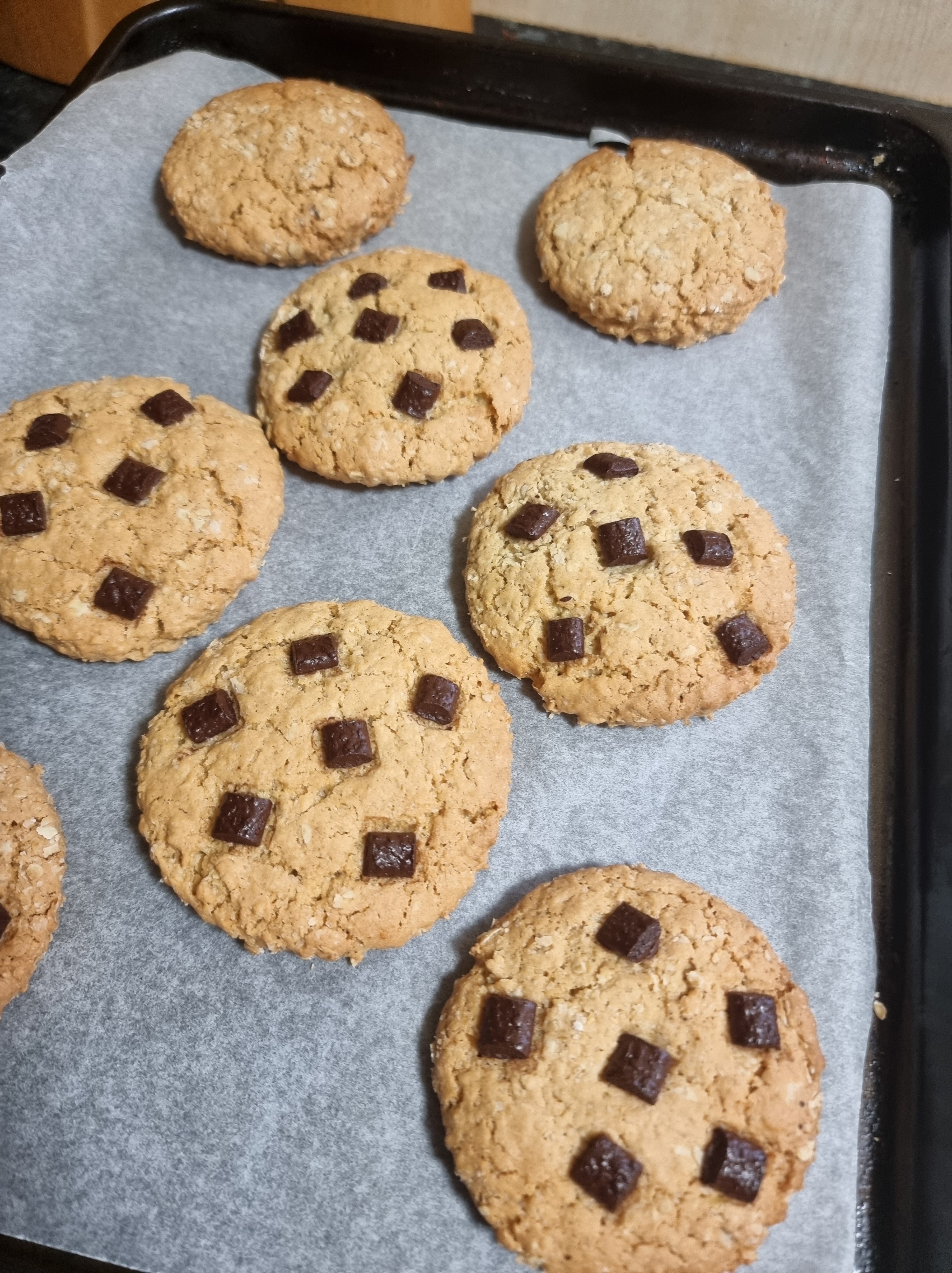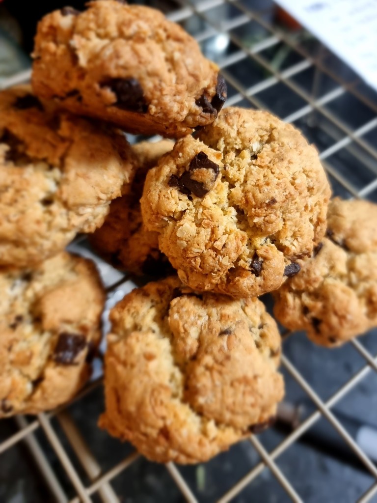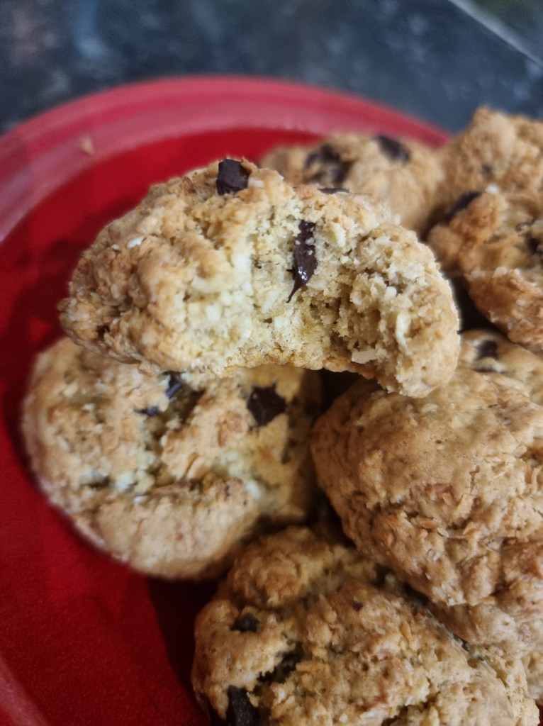 Mix in the coconut, oats and chocolate chips by hand. Shape either into small balls and flatten slightly, or flatten out the mix and use a cookie cutter. I did some more today using that method, and without coconut and chocolate for some, as coconut is not to the entire households taste 😉