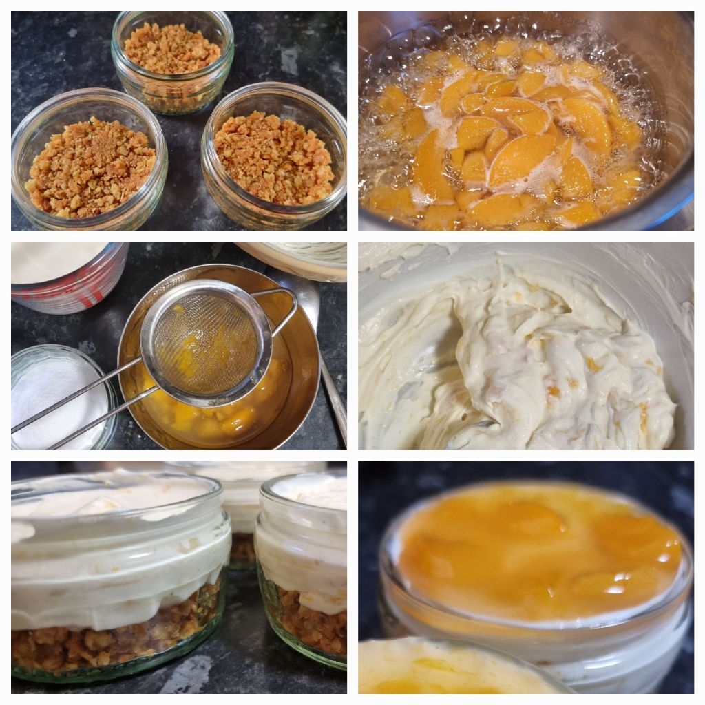 Mix the cream cheese to soften and stir in the vanilla extract, whip the cream and sugar until stiff. Fold the peaches and whipped cream through the cream cheese until combined. Then add to the ramekins, add some peaches amd syrup on top and put in thr fridge for a few hours. Then eat and enjoy.