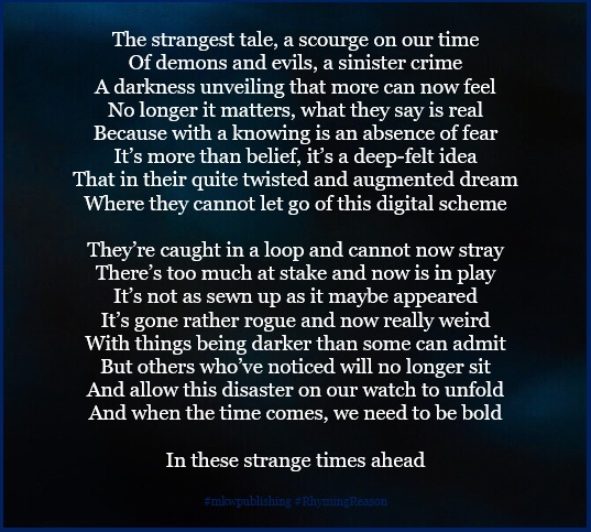 The strangest tale… (rhyming reason) July 11, 2024June 30, 2025 ~ MKW Publishing (c) MKW Publishing Share this: Click to share on X (Opens in new window) X Click to share on Facebook (Opens in new window) Facebook Like Loading... Related