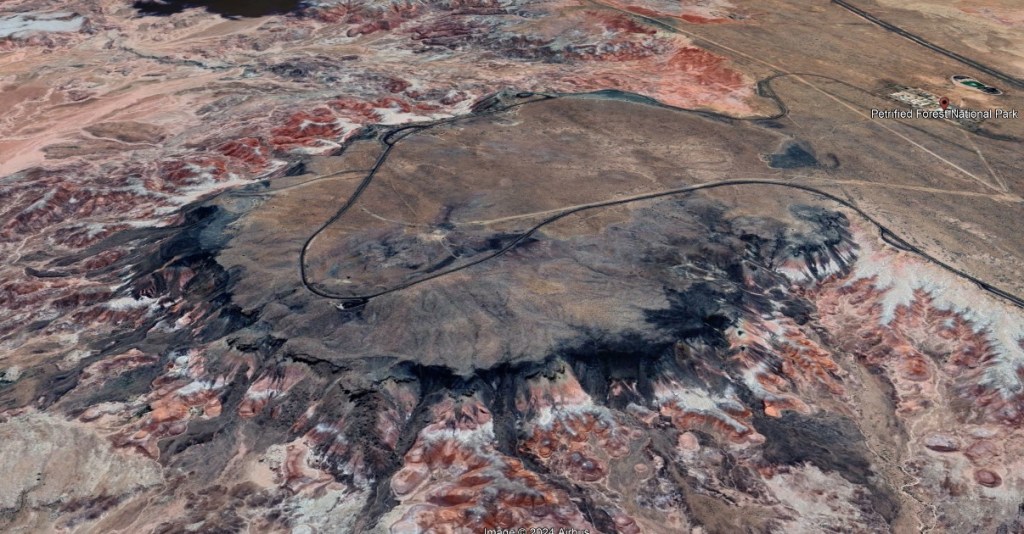 The petrified forest in Arizona. An entire ancient petrified forest with evidence of it lying all around and cover a vast area. I have looked at it before online, but hadn’t previously noticed the shape of it until scanning from above quite a way around one area. A dark area that looked funnily, like the outline of a tree stump but huge. Giving rise to more thoughts towards the talk of old times, of fantastical times when things were much bigger and maybe a bit more magical. Giant trees come up now and again online, and Devils Tower is put forward as one as discussed in A Giant Debate.