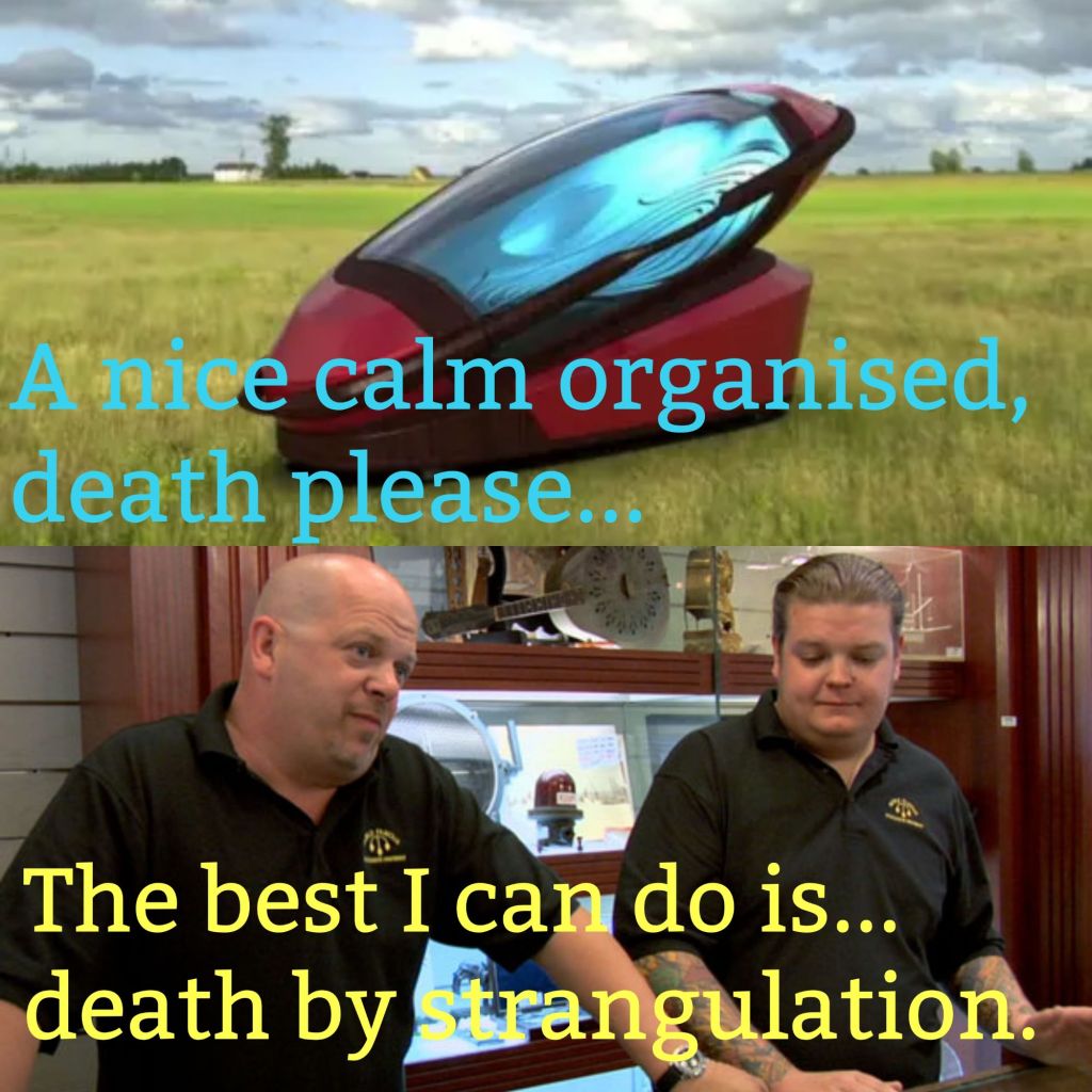 But the latest development, after the 2021 announcement that suicide pods were to be available for the new scheme of MAID being introduced in certain countries, has given it an even further sinister twist. If there could be an even More Than Sinister twist to something like that, but nobody should be surprised that with the times we are in, one managed to occur. The talk in the media is, the first person who used it didn’t die such a dignified and calm death after all, and looks like she was perhaps strangled to death instead as the pod possibly malfunctioned.