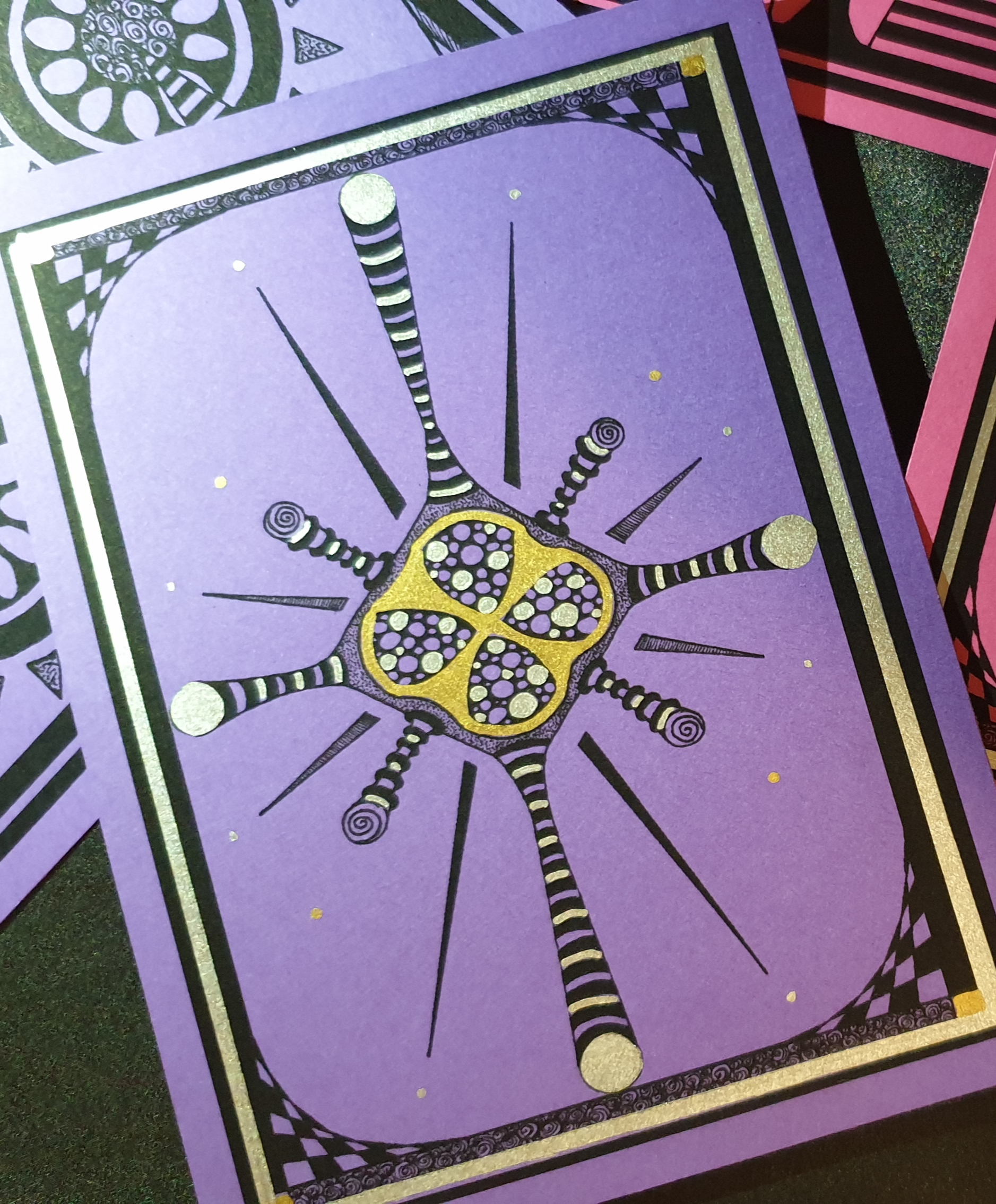 I brought some new coloured card having previously only used red, blue, green and pale lilac. I use my hand drawn art to print on the card, then I add the extra touches by hand. Once I have a set completed, then I will post the finished product. Getting the reflective silver and gold to shimmer in the photographs isn’t working out so well yet.