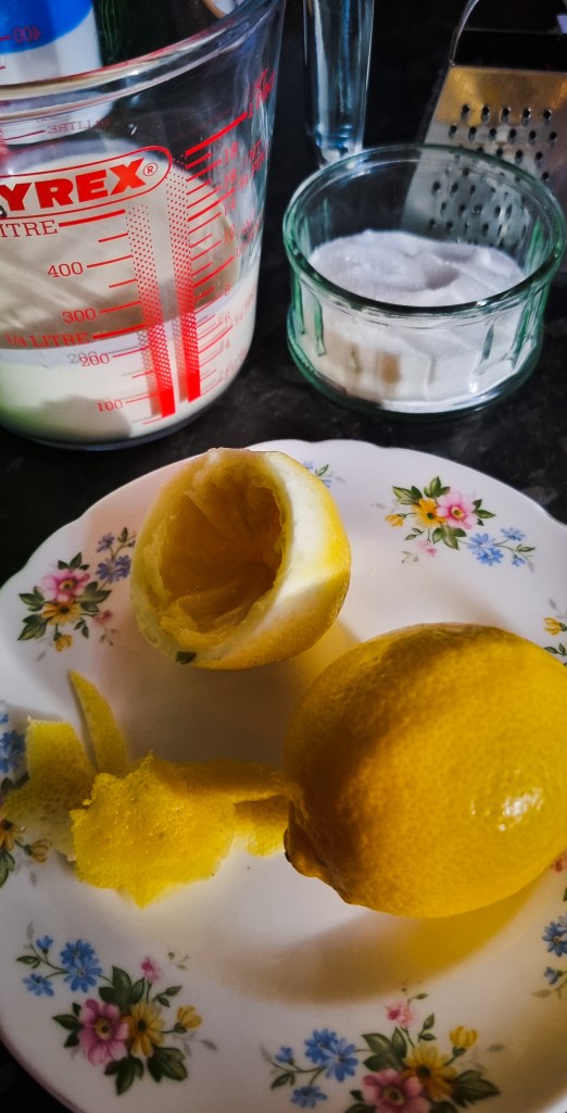 Method – melt the cream and sugar together on a low heat and slowly bring to the boil, stiring with a whisk and add some rind (peeled and grated in this case), then simmer for 2-3 minutes.