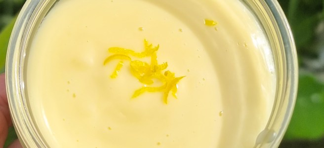 Then pour into chilled ramiken dishes (this recipe makes 2) – and let them set for at least 4 hours, or overnight. Then enjoy the lemony goodness.