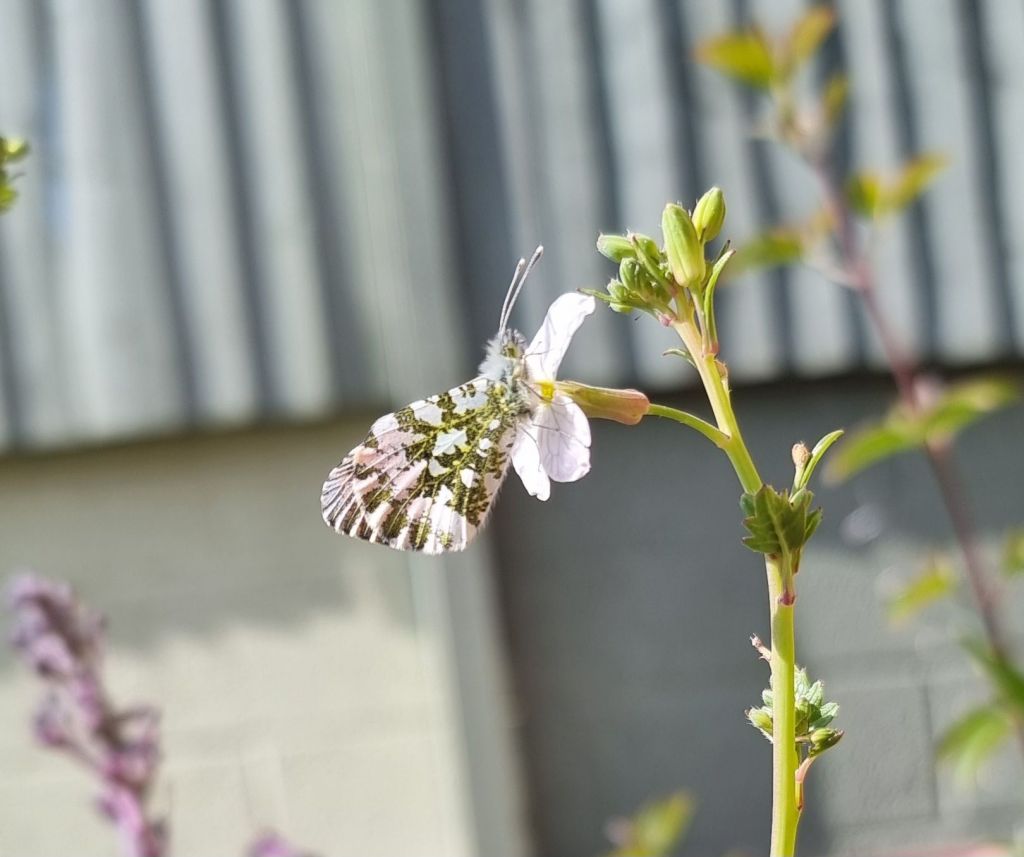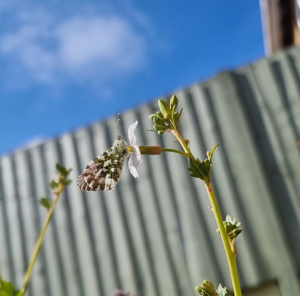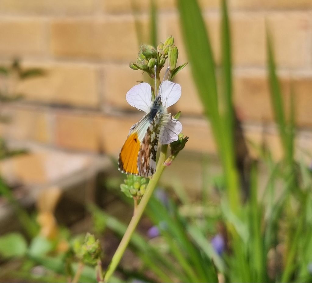 A lovely little orange tip stopped for pics today, the second one seen this week, which is exciting as they don’t often pass through here. Looks like the surprise black radish that made it through is flowering and appears to be what they like.