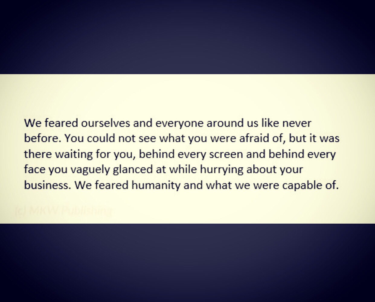 Thrown in between were other things to be afraid of, murderers, viruses and catastrophic natural events and man-made ones threatened every year. The O-zone, solar flares, earthquakes, asteroids, tsunamis. It was endless.