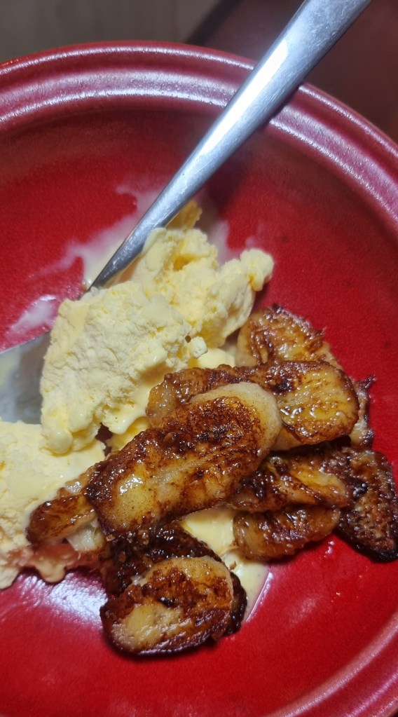 Not sure why I hadn’t tried this previously, easy and delicious. Bananas, melted butter and sprinkle brown sugar over while they are lightly frying, turn over after a few minutes and cook on both sides. I put a little coconut on as well and had with vanilla ice-cream.