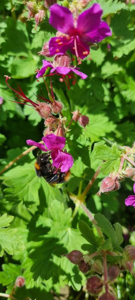 Another treat, after accidently disturbing this little bee while gardening, it crawled onto my hand and warmed up for 10 minutes before setting off. Then popped back a short while later for some rest and pollen from the nearby geranium I thought it might like.