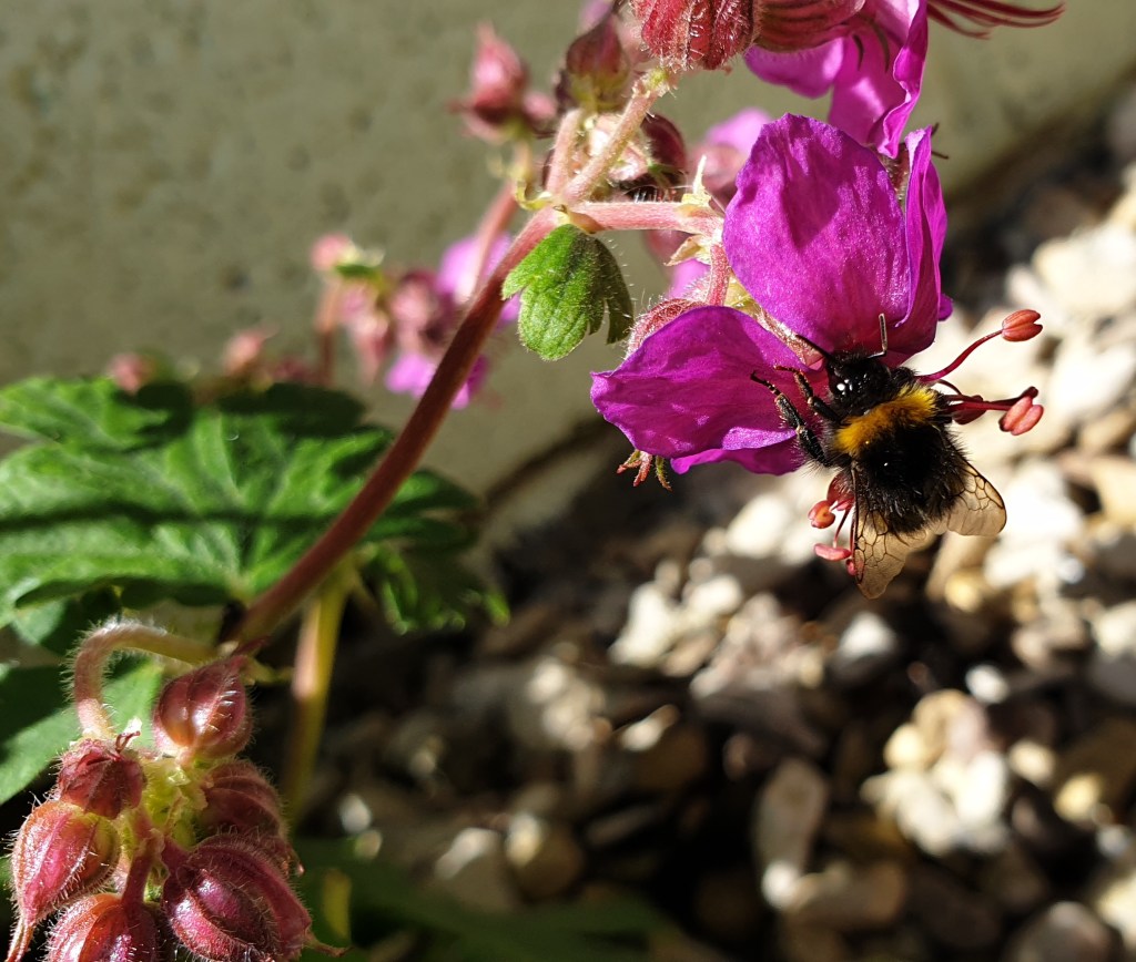 Yesterday saw the arrival of the very large bumble bees, I don’t think I have seen ones that big since being in Spain. But they also love the buddleia, even disappearing into it on their forage. But this one was a timely hit of the record button in slow motion as it took off. It was only after playing it back did I realise that the sound had picked up the wings sounding like a chopper 🙂 – sound on for full effect.