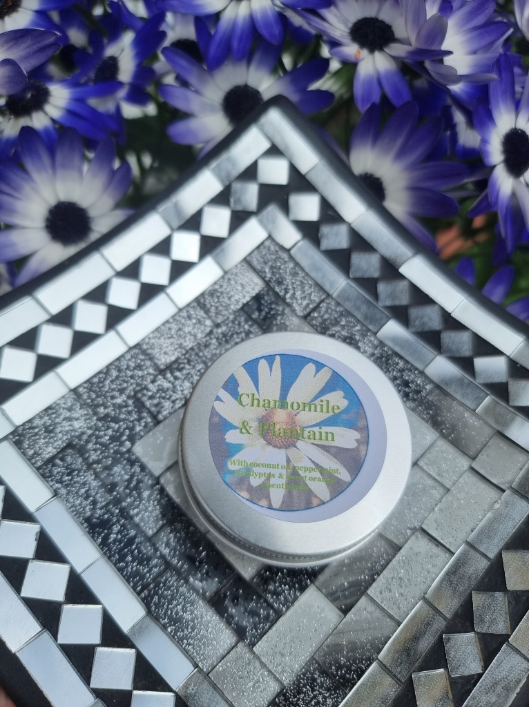 Another new salve, this one is chamomile and plantain with coconut oil and peppermint, eucalyptus and sweet orange essential oil. This one can be helpful for sinus issues.