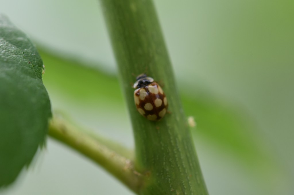 After seeing lots of ladybird larvae on my rose bush that had grown very tall in the last few months, I’ve been checking in case I see any grown up and today I saw them all. I don’t think I was checking properly before, just a quick glance and you can miss them. But I believe there are 5 different ones, just today, on one plant! One had strayed over to the charlock too.