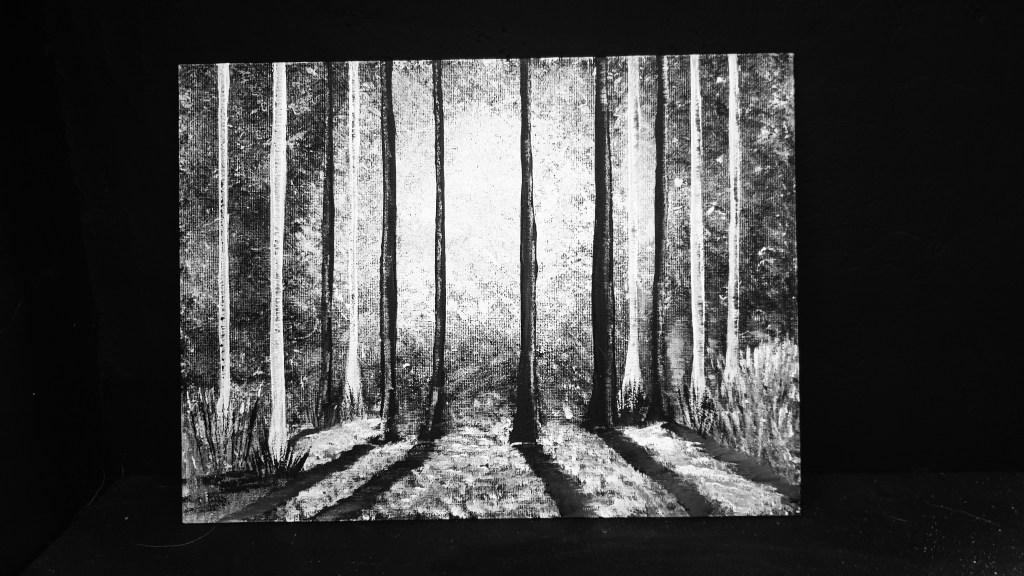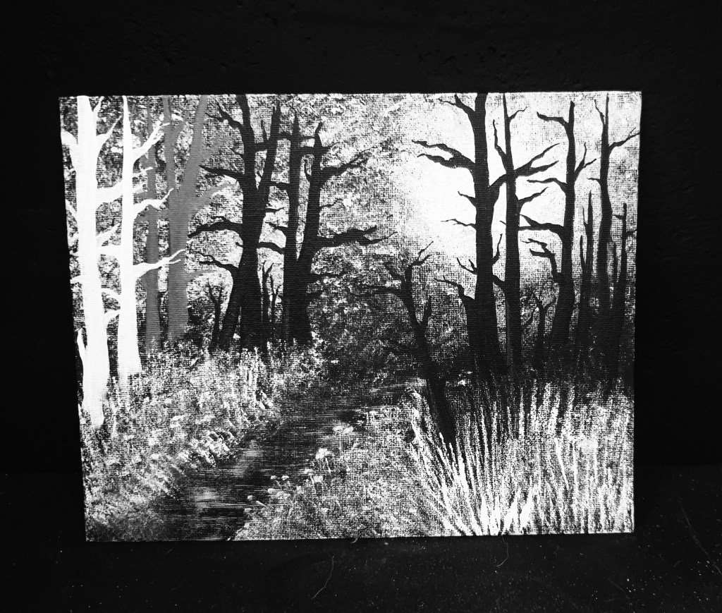 Turns out I really do enjoy painting trees, and with the new style I’m doing it requires a black, white and grey painting first before the colour glaze is added after with oil paints.